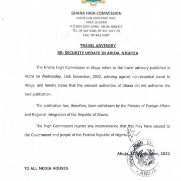 The Ghanaian Authority has withdrawn its earlier travel advisory issued on Nov. 16, warning its citizens against nonessential travels to Abuja, Nigeria over alleged security threat, stating that the earlier publication was unauthorized.