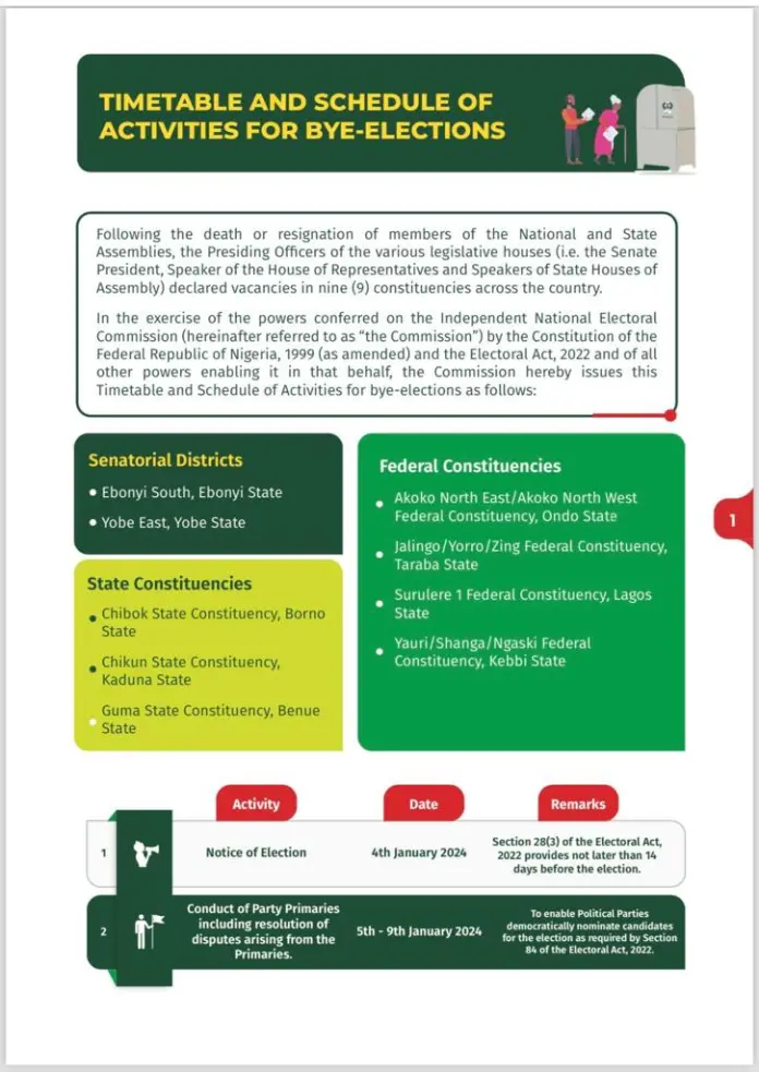 The Independent National Electoral Commission (INEC) has released timetable and schedule of bye-elections and court ordered re-run elections resulting from resignations and demise of members of State Houses of Assembly.